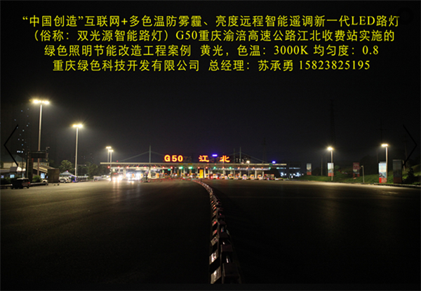 Division I (national high-tech enterprises) in Chongqing G50 Chongqing Fuling expressway toll station Fusheng implementation of the "Chinese creation" Internet plus color temperature, brightness and anti fog haze remote intelligent remote control of a new generation of LED Street (commonly known as: Chameleon intelligent street lamp) green lighting project. In the highway lighting in the use of the Chinese creation "Internet plus color temperature, brightness and anti fog haze remote intelligent remote control of a new generation of LED street lamp and the intelligent control system, better stability, higher reliability, color, light response speed is more agile. It has four major characteristics: the technology has four major characteristics: (a) by PM2.5 sensor, temperature sensor, ultrasonic sensor, radar remote camera automatic acquisition of environmental protection, meteorology, transportation, security and other information, analyze the information sharing and data services through the cloud platform. (two) in different climate and season, according to the change of climate and environmental sensory needs people, through the temperature sensor, humidity sensor, PM2.5 sensor, intelligent remote control to achieve a variety of lighting lamps, color temperature, improve the human sensory comfort. The remote intelligent control system automatically collects the temperature, rain, fog and haze data of the lighting environment, and intelligently regulates the light color temperature to be the most comfortable and safest lighting value (3000K-5700K). (three) the brightness of light can be remotely intelligently adjusted. In different time periods, different light intensity, different traffic flow, etc., through the photosensitive sensors, ultrasonic sensors, radar sensors and other intelligent control, to achieve a variety of brightness lighting mode. In different periods of light adjustment for a variety of lighting mode, including "daytime mode", "night mode", "summer mode" and "winter mode" and "anti haze mode", which greatly improve the saving rate, and effectively solve the tunnel lighting for saving electricity is widely adopted for closed control loop or interval lights cause lighting the dark zone, the presence of traffic safety problems. (four) the important parameters such as luminance uniformity, illuminance uniformity and energy saving rate are all better than the national standard of LED street lamps. A new generation of multi-color temperature LED intelligent street lamp, one can be used when more than one ordinary monochromatic temperature LED street lamp, the cost performance is higher, can improve the light efficiency of 10%, and prolong the service life of lamps more than doubled. Intelligent color matching and dimming lighting are more comfortable, safe and energy-saving. This product is our use of a number of independent patent technology (patent number: 201320842388, 201320028126, 2015204938054) R & D, manufacturing "China creation" Internet plus color temperature anti haze brightness remote adjustment of a new generation of LED intelligent lighting products, the science and technology novelty has won the "novelty search report" (No: J201508016831). That is the "China creation", the one and only LED lamps advanced technology application of intelligent manufacturing technology; it has been included in the "2015 annual scientific and technological achievements into the project" Chongqing City SME (small enterprises in Yuzhong 2015 No. 188), approved the establishment of Chongqing City Engineering Research Center [LED Intelligent Control Technology Chongqing 2015 technology development and reform No. 1865]; has been included in the "2016 Chongqing Internet plus pilot demonstration project", "2016 year Chongqing city technology innovation guidance project". Has obtained "Chongqing hi tech products", "Chongqing municipal industry new technology certification" certificate.
